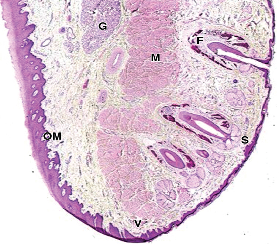 OM = oral mucosa Internal zone (faces lumen inside mouth) = is opposite side of skin. Contains minor salivary glands (G) and muscle (M)