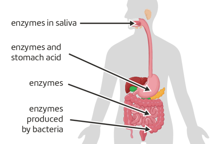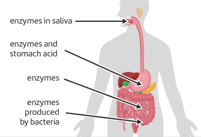 Enzymes in saliva** break down** starch while enzymes in the small intestine break down sugars and fats.