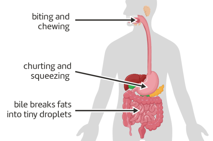 Physical digestion breaks food into smaller pieces without forming any new substances.