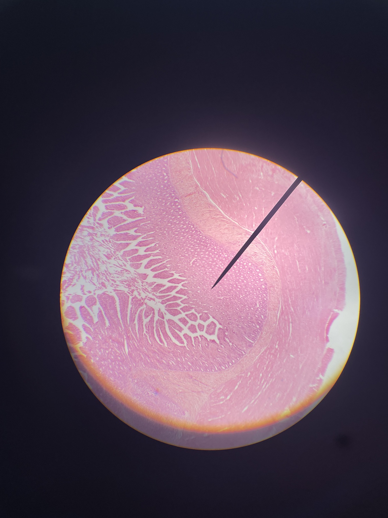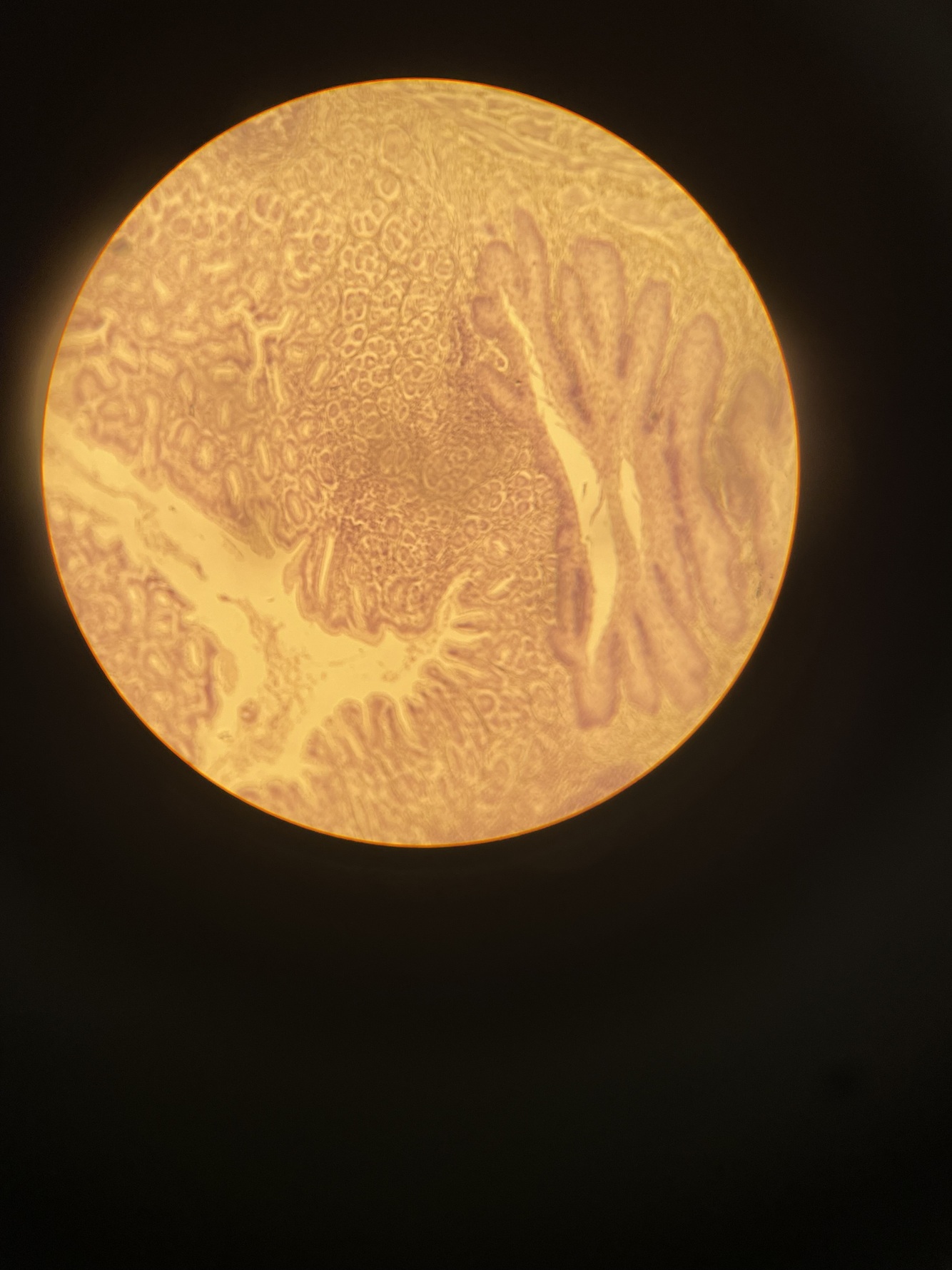 the right is esophagus the left is stomach; notice the stratified squamous of the mucosa of the esophagus compared to the simple columnar of the stomach mucosa