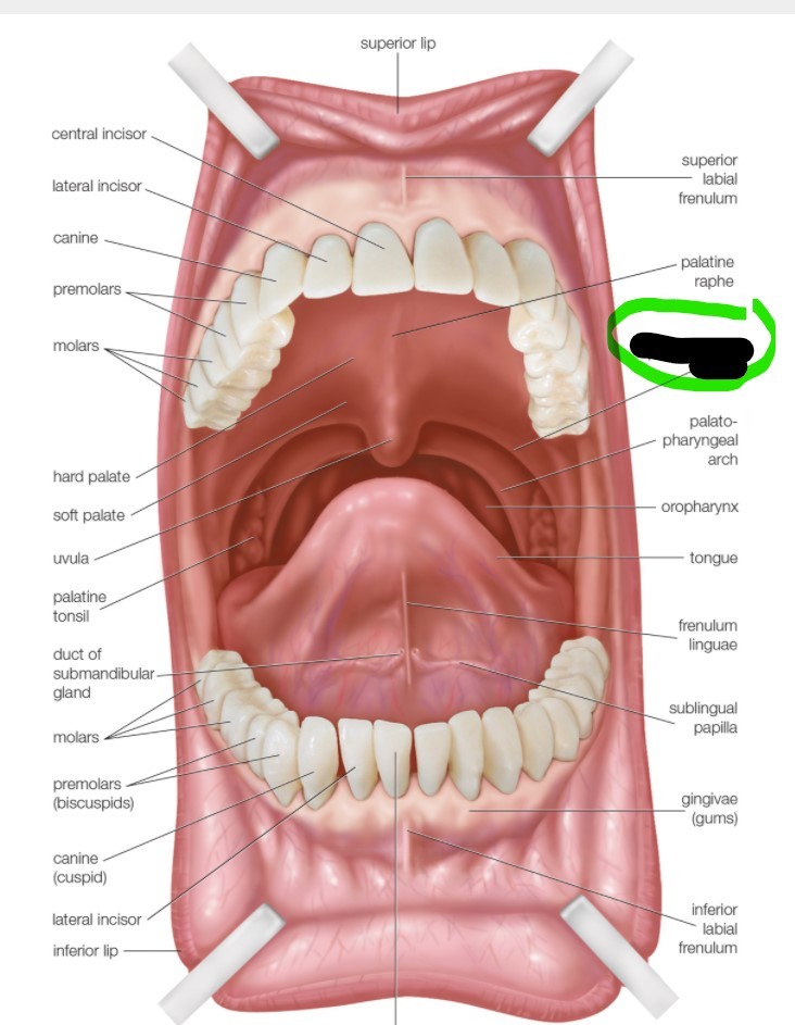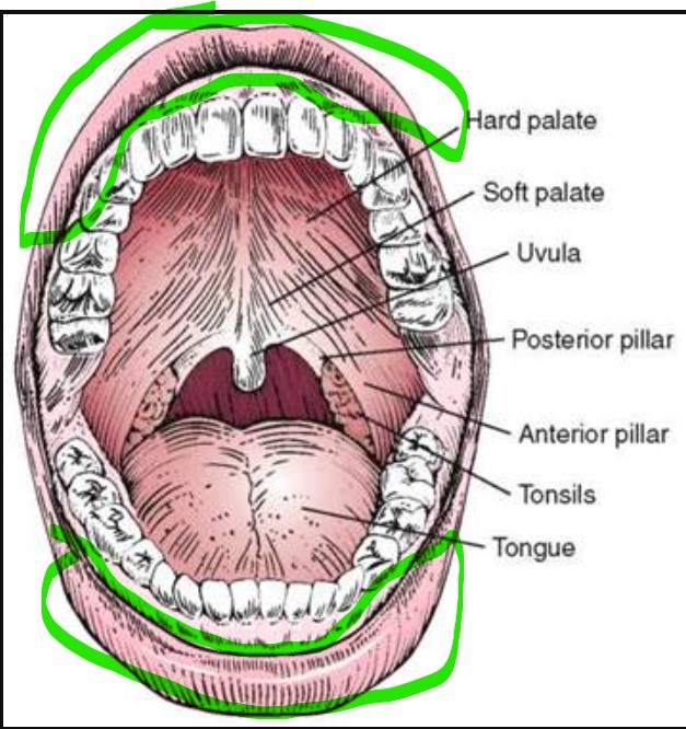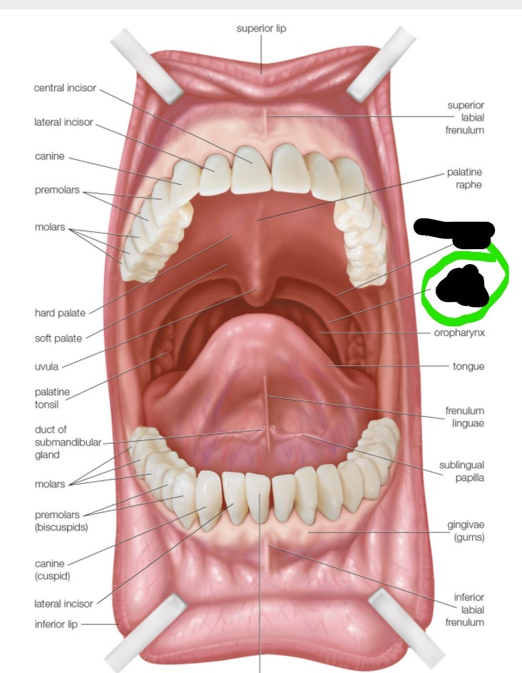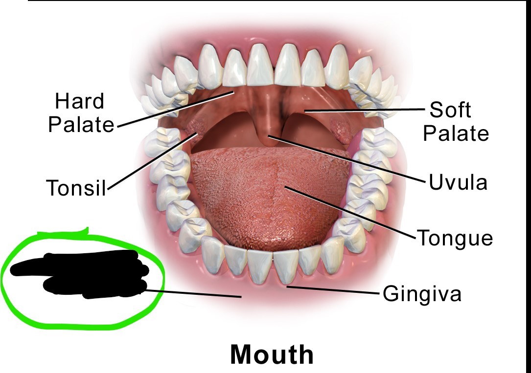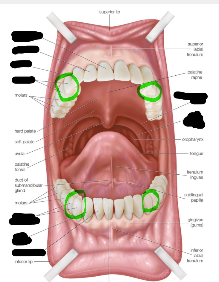 The horseshoe-shaped vestibule is situated anteriorly. It is the space between the lips/cheeks, and the gums/teeth.