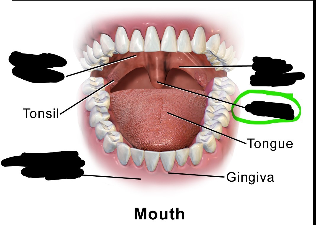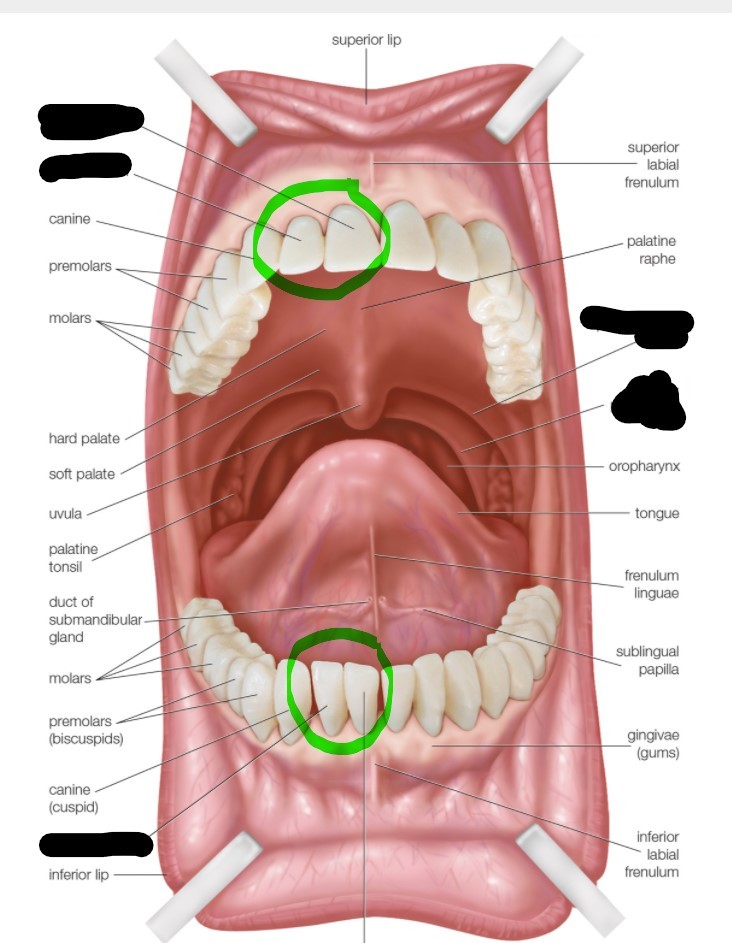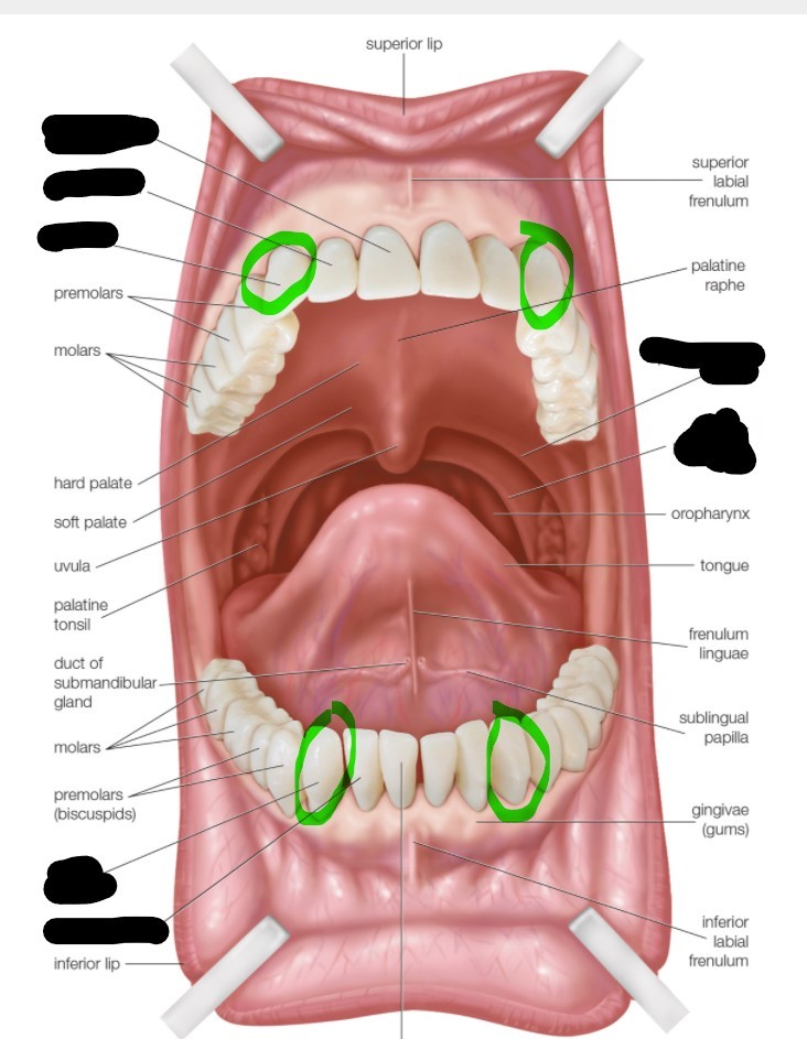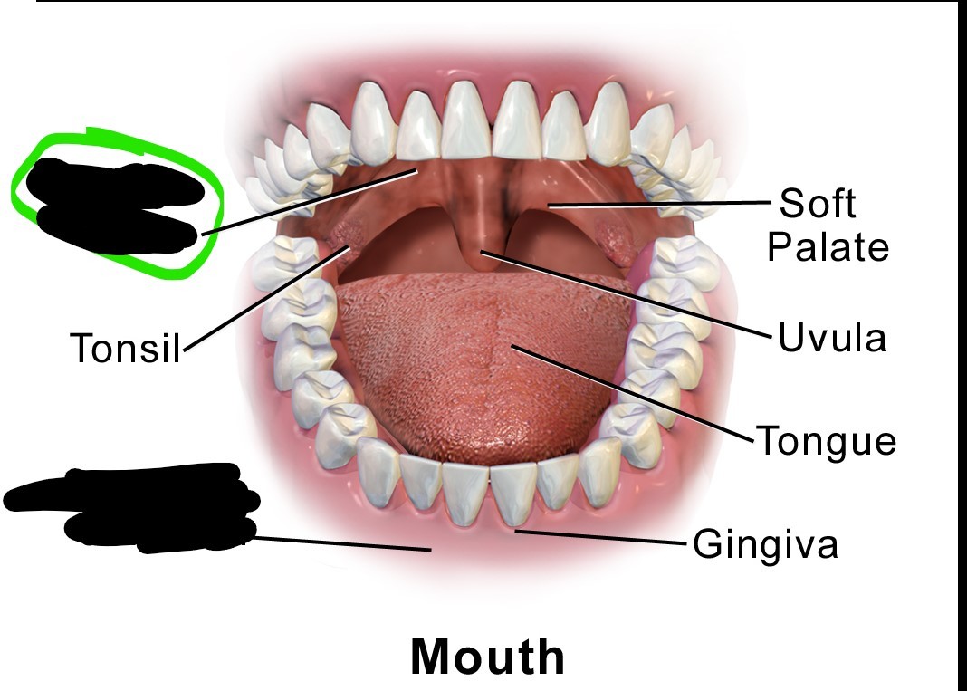 The horseshoe-shaped vestibule is situated anteriorly. It is the space between the lips/cheeks, and the gums/teeth.