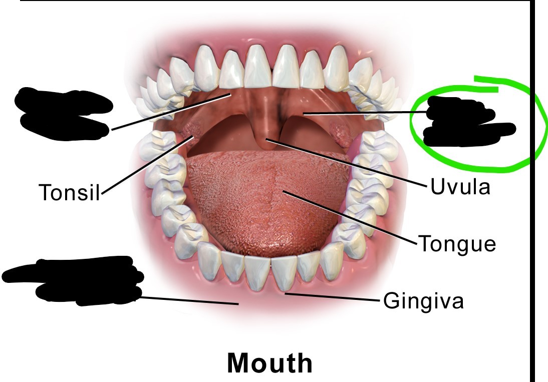 the muscular part at the back of the roof of the mouth. It sits behind the hard palate, which is the bony part of the roof of the mouth. The palates play important roles in swallowing, breathing, and speech