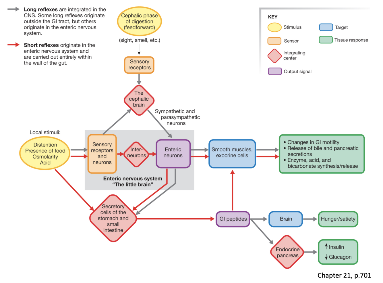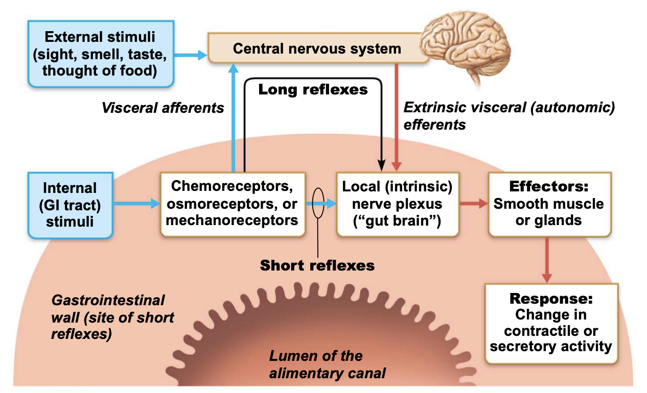 Long reflexes- respond to stimuli arising inside or outside of the gut, such as from autonomic nervous system