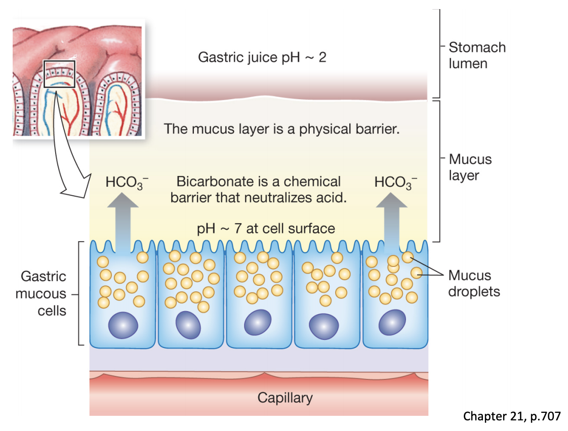 Explain the role of mucus and bicarbonate in protecting the gastric mucosa