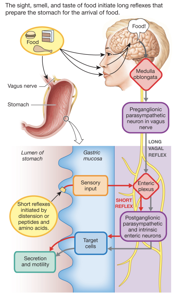 Cephalic phase is anticipatory. Slight, smell, taste and thought of food trigger long reflexes via vagus nerve which serves to prepare the stomach to receive food