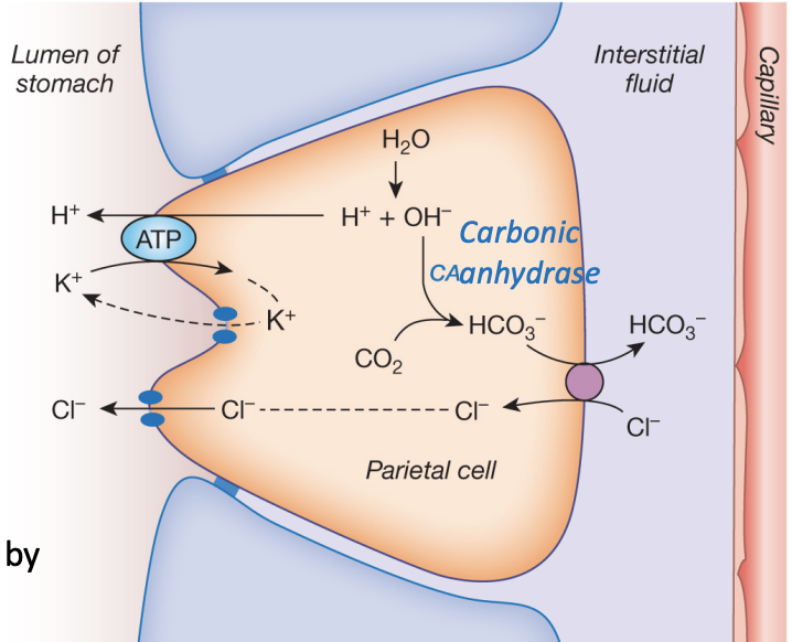 Parietal cells pump H+ (from carbonic acid breakdown) into stomach lumen via H+/K+ ATPase (proton pumps).