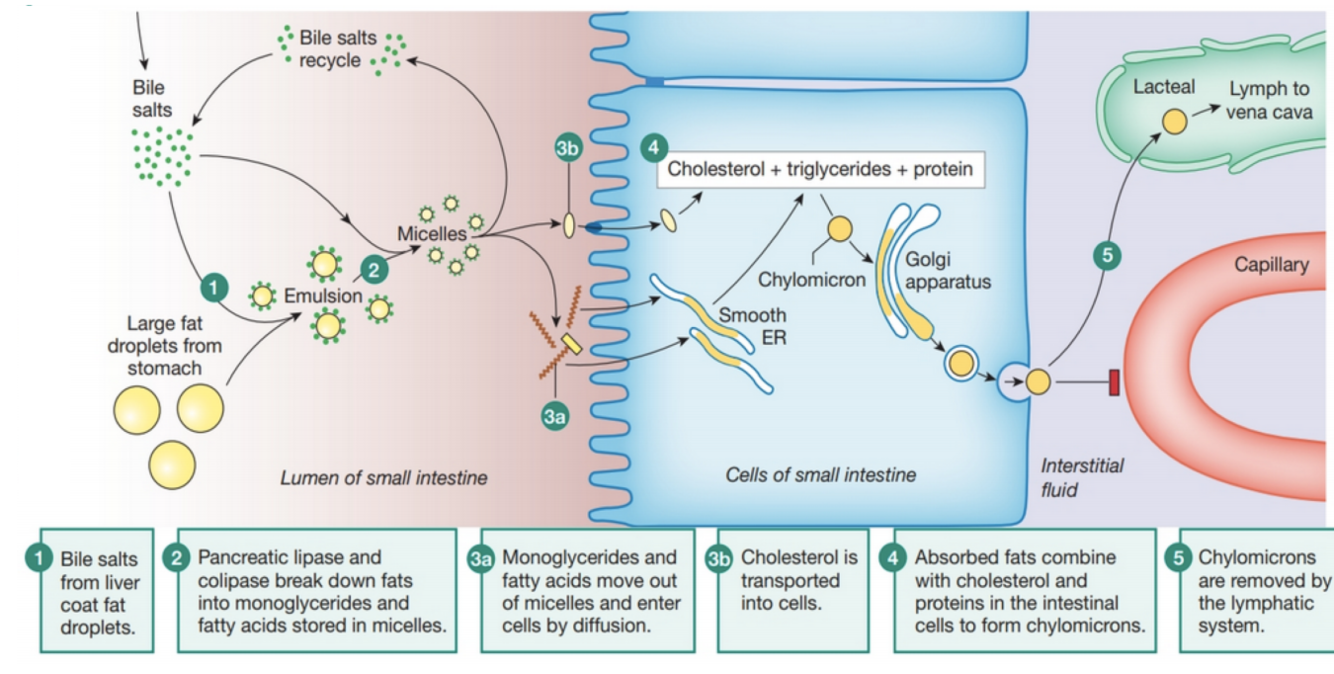 Fats broken down into chloromicrons and absorbed into the lymphatic system and then move into the bloodstream