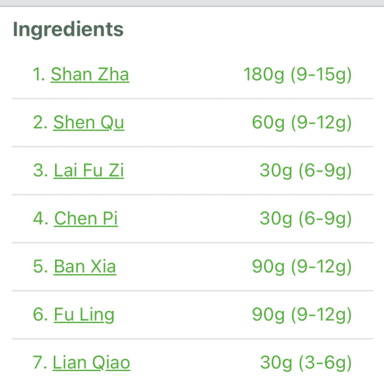 Shan Zha (Fructus Crataegi) / Ge Gen (Radix Puerariae) - release exterior/ Dan Shen (Radix Salviae Miltiorrhizae) - activate blood / San Qi (Radix Notoginseng) - regulate blood/ Jue Ming Zi (Semen Cassiae) - clear heat drain fire / Jiao Gu Lan (Rhizoma seu Herba Gynostemmatis) - tonify qi