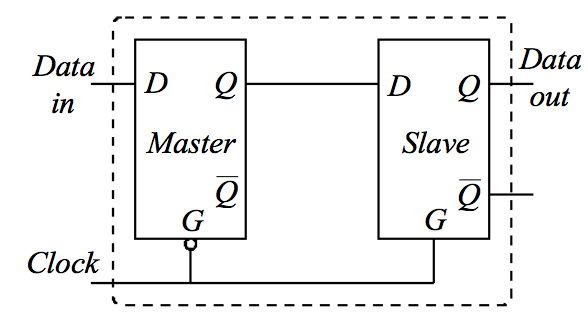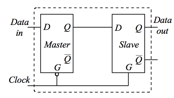 Draw the Master-Slave arrangement of D-latches required to produce a D flip-flop