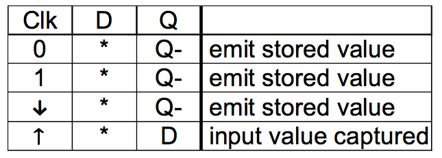 On the high-low edge the current Q output is ‘frozen’ and ignores any further D input changes