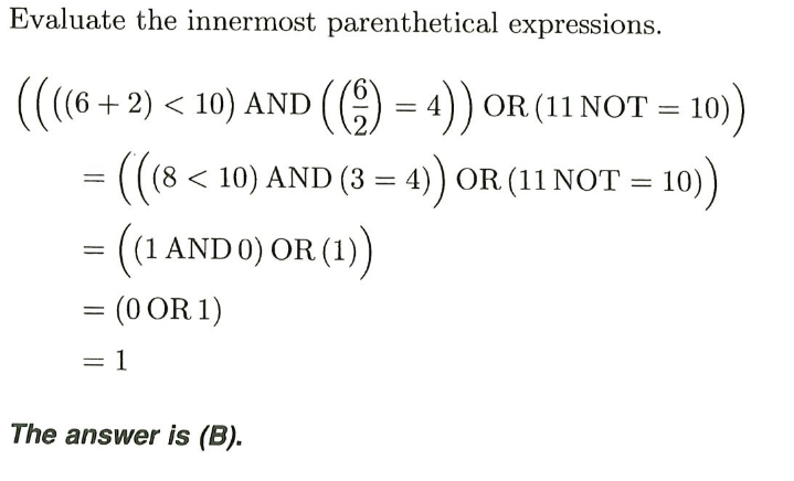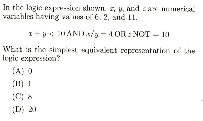 Since this is a logic (Boolean) expression, the result must be either TRUE or FALSE, which can be represented as either “1” or “0”.