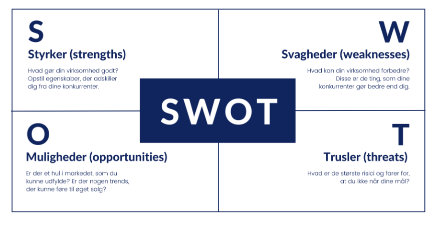 SWOT er et strategisk værktøj til at identificere og analysere en virksomheds interne og eksterne faktorer:
