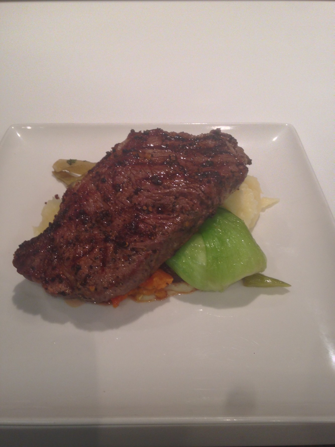 cracked pepper-crusted new york striploin, wilted spinach, jack daniel’s pepper sauce, buttery yukon gold potato purée