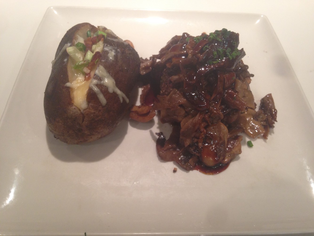 9oz. sirloin, oyster, shiitake & button mushrooms saute, wilted spinach, all-dressed baked potato