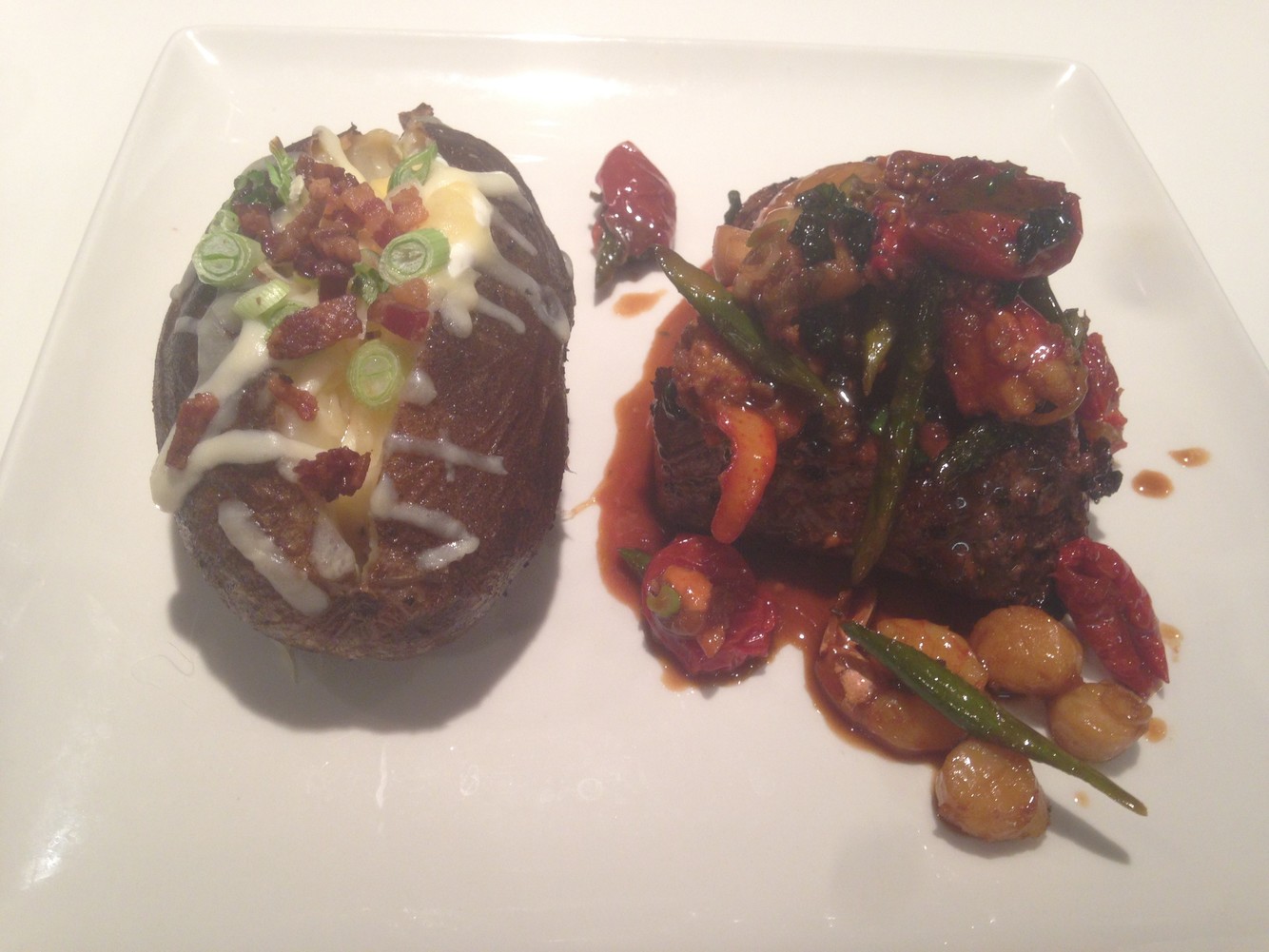 7oz. filet mignon, roasted potatoes, asparagus, red wine reduction