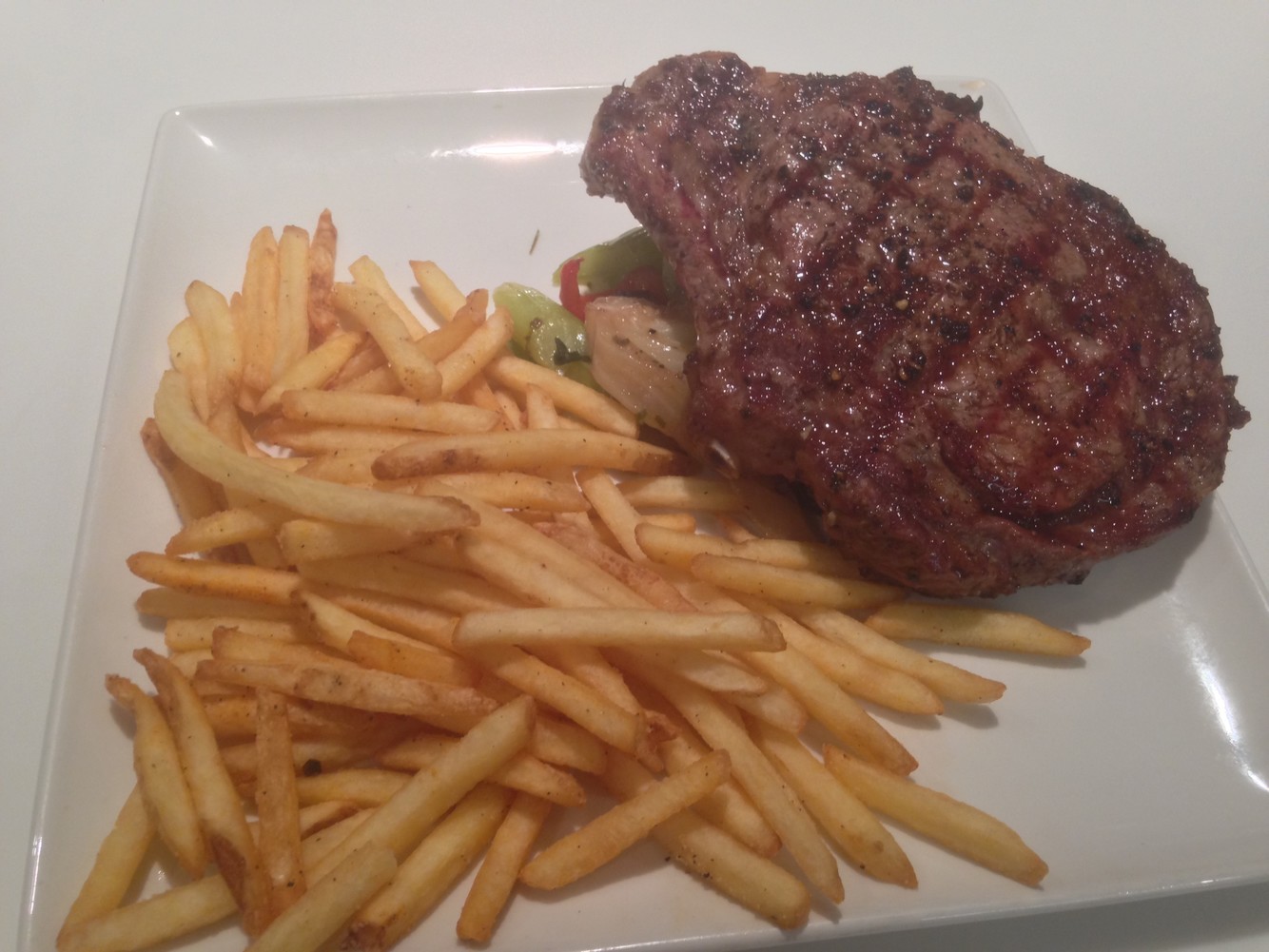 centre cut from the rib section, well-marbled with great flavour, served with skinny fries, seasonal vegetables