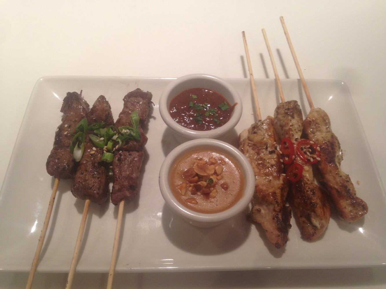 marinated beef skewers, piri piri sauce, marinated chicken skewers, peanut dipping sauce