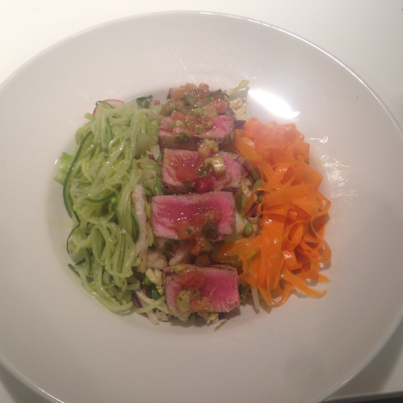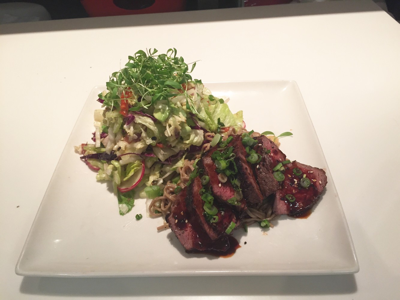 grilled sirloin, romaine, napa & red cabbage, soba noodles, avocado, cucumber, chives, soy-ginger vinaigretttte