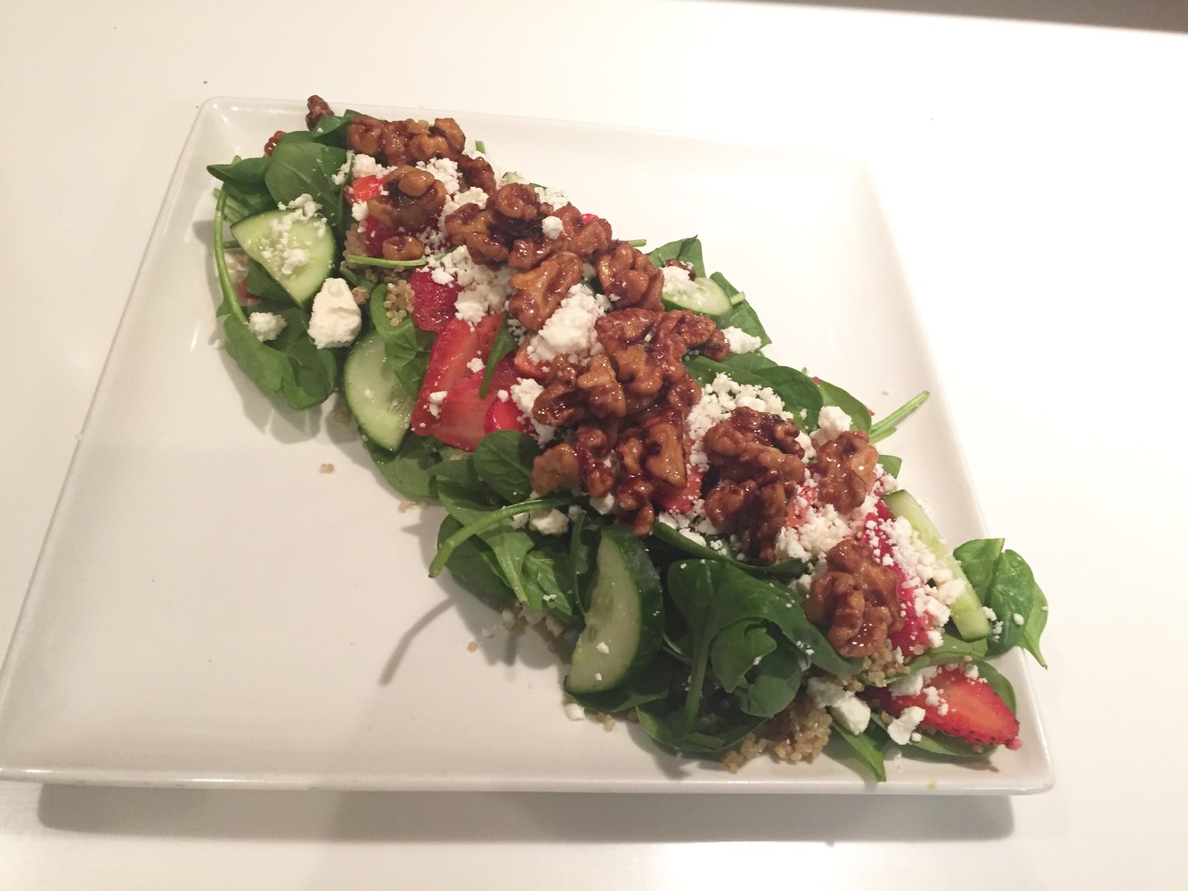 baby spinach, strawberry, feta, quinoa, walnuts, balsamic viniagrette; add chicken +6
