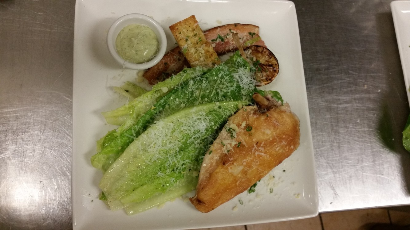 bone-in roasted chicken breast, romaine heart, thick-cut bacon, parmesan crostitini, roasted garlic dressing