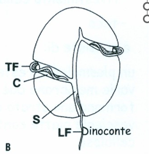 Dinokont cell: Two flagella emerge at the intersection of the transverse and longitudinal grooves (ventral side)