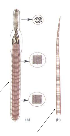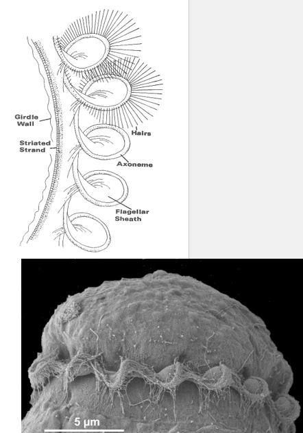 The transverse flagellum is constituted by an axoneme arranged in a spiral; the axoneme is flanked by a striated strand. Axoneme and striated strand are both enveloped by a sheath.