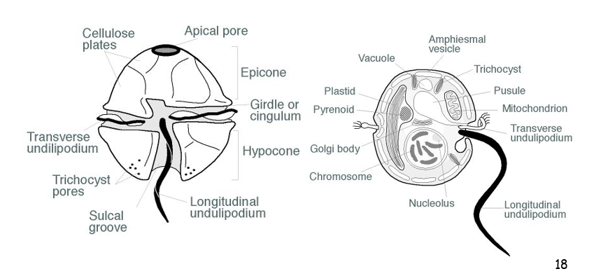 The transverse flagellum, ribbon-like, lies in an equatorial groove, called cingulum, surrounding the cell