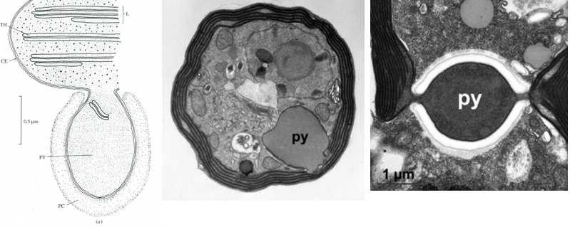 Dinoflagellates have various types of pyrenoids.