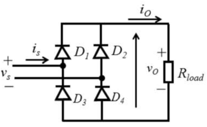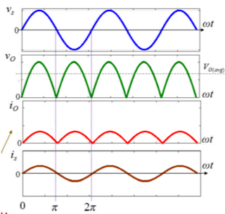 Draw the graphs for VS, VO, IO, IS for a diode bridge rectifier with a resistive load