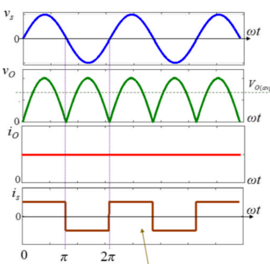 Draw the graphs for VS, VO, IO, IS for a diode bridge rectifier with an inductive load