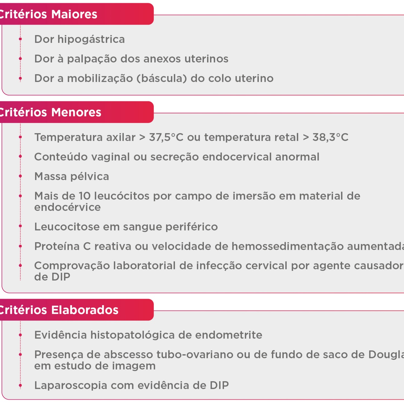 Menores: TAX > 38,5°C, contração vaginal/ cervical anormal, massa pélvica, leucocitose, proteína c reativa/ tempo hemossedimentação aumentadas e comprovação laboratorial da infecção por clamídia, gonorreia e mycobacterium