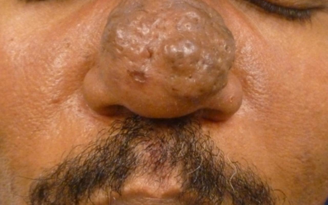 CO2 resurfacing and ablative lasers (10,600 nm) are the best for severe rhinophyma as is seen here.