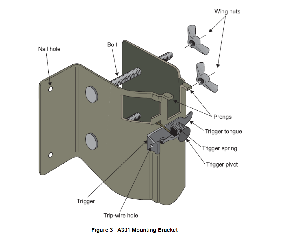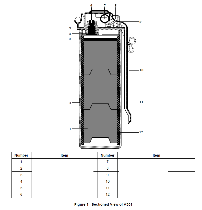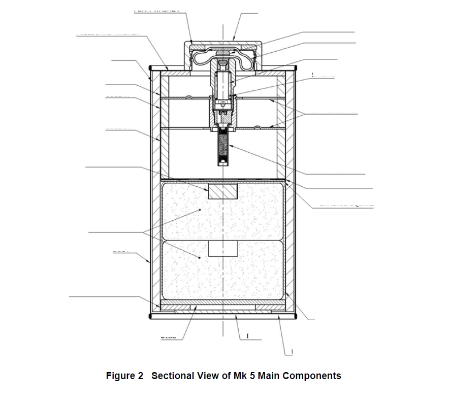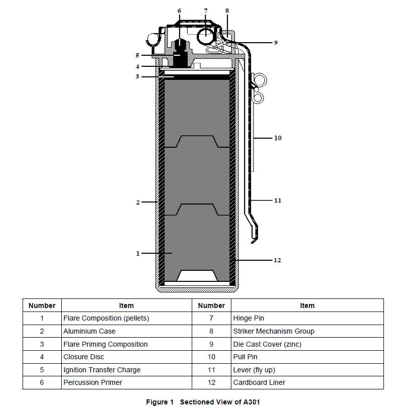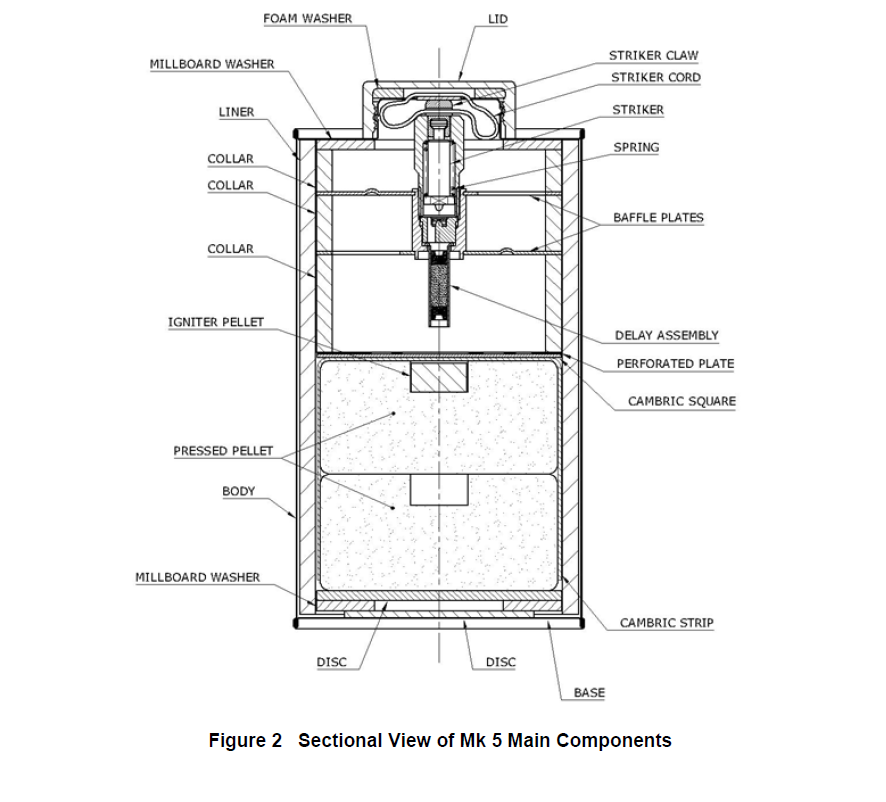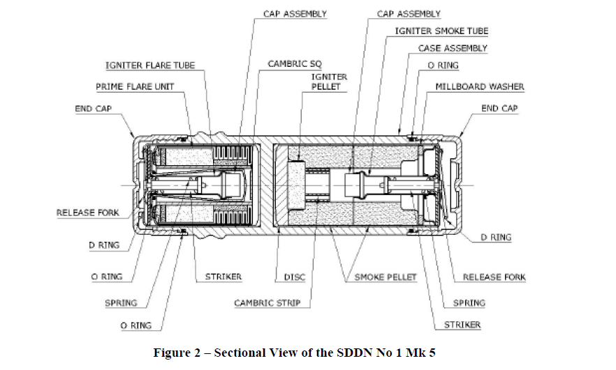 Flare/(Smoke) Unit. The flare/(smoke) unit consists of three layers of flare composition (a smoke composition) housed in an aluminium liner. A percussion igniter extends through a central hole in the unit. The igniter’s striker is held in a safe position by a safety fork which engages a groove in the outer end of the striker; a D ring is secured through a swivel link to the safety fork. The D ring and swivel link are located immediately beneath the threaded end cap.