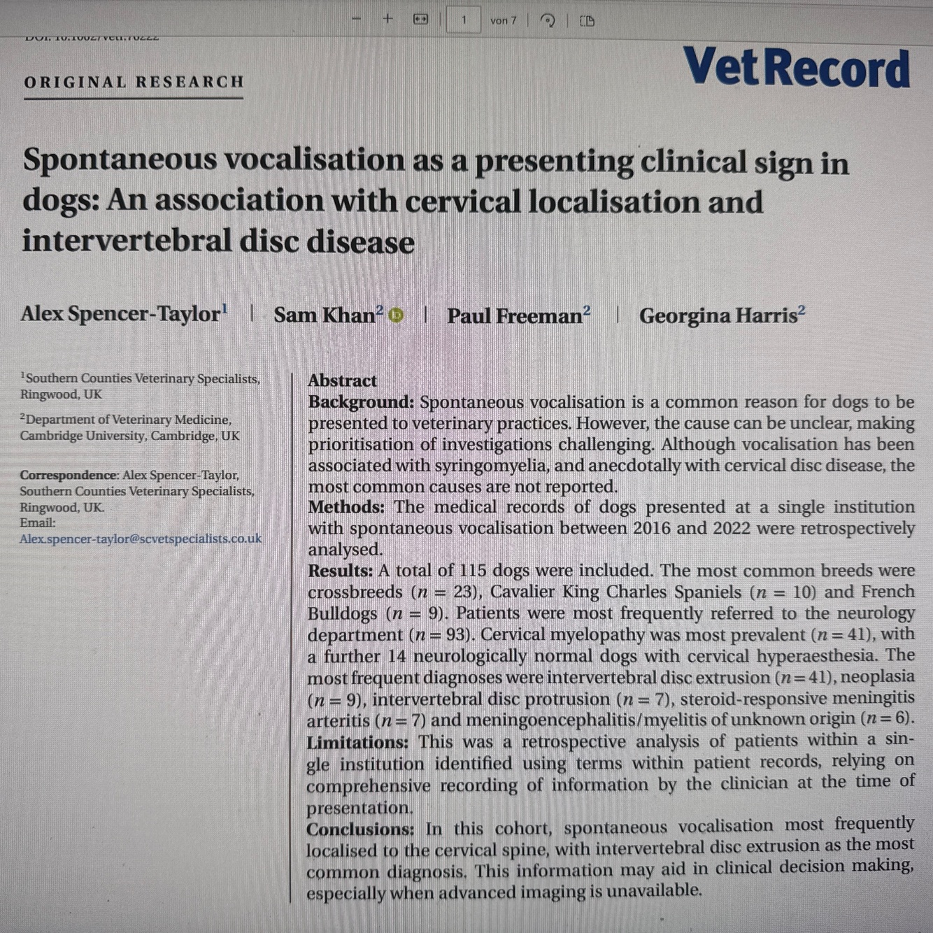 What is the most common reason for spontaneous vocalization in dogs?a) cervical intervertebral disc disease b) syringomyeliac) SRMAd) atlantoaxial instability