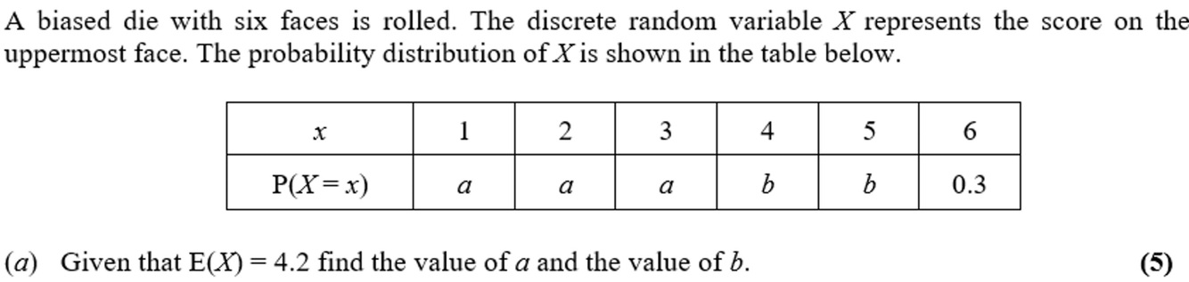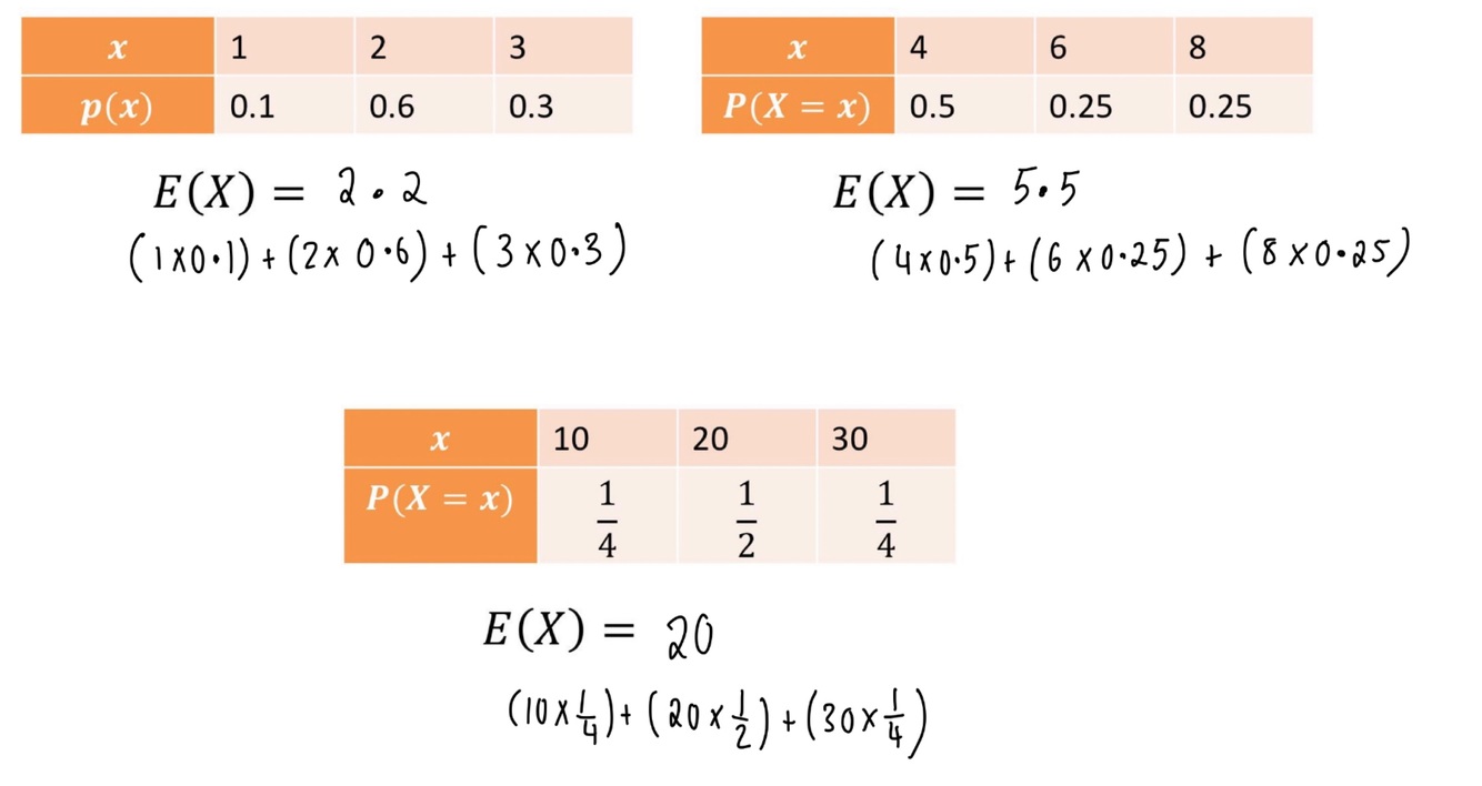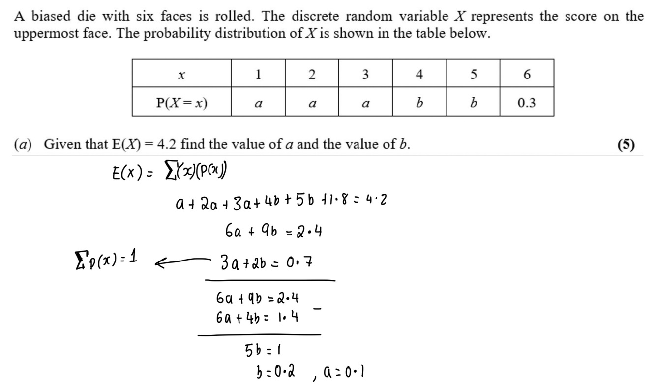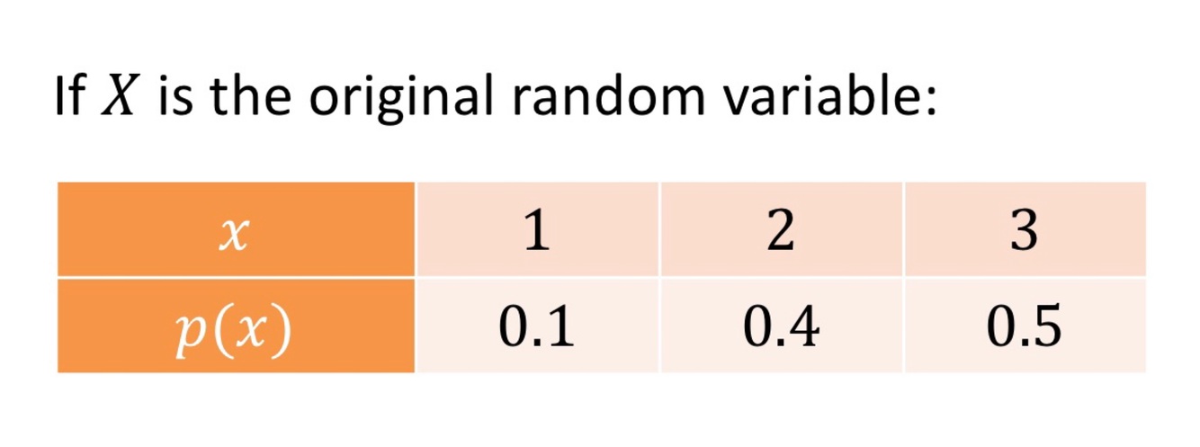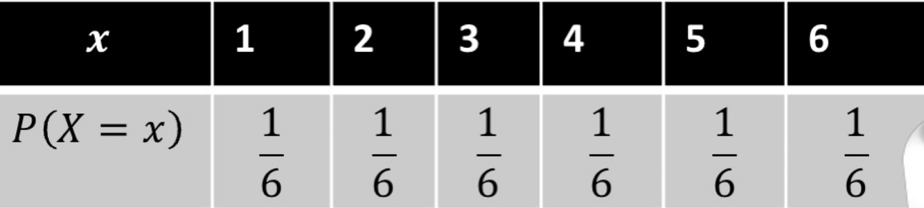 the probability that the outcome of the random variable X is the specific outcome x, eg: 1,2,3,4,5,6