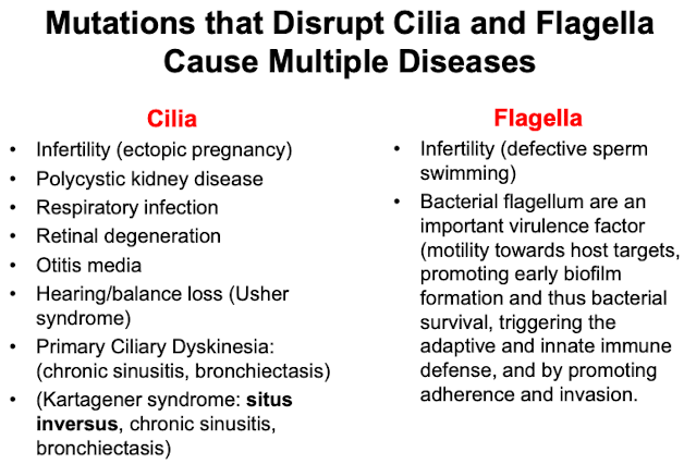 What are some mutations that disrupt cilia and flagella? What diseases are associated with these mutations?