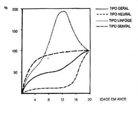 Como é o crescimento da criança: geral, neural, linfoide, genital (curvas)?