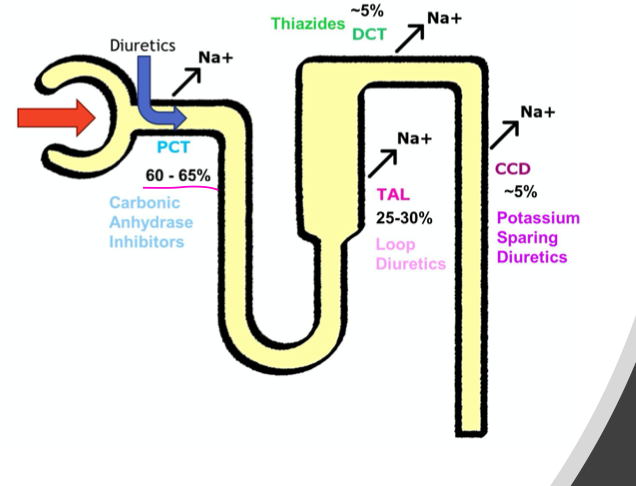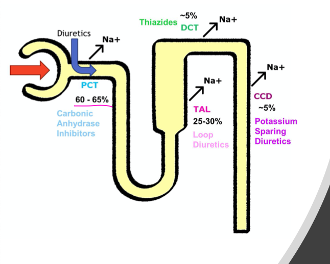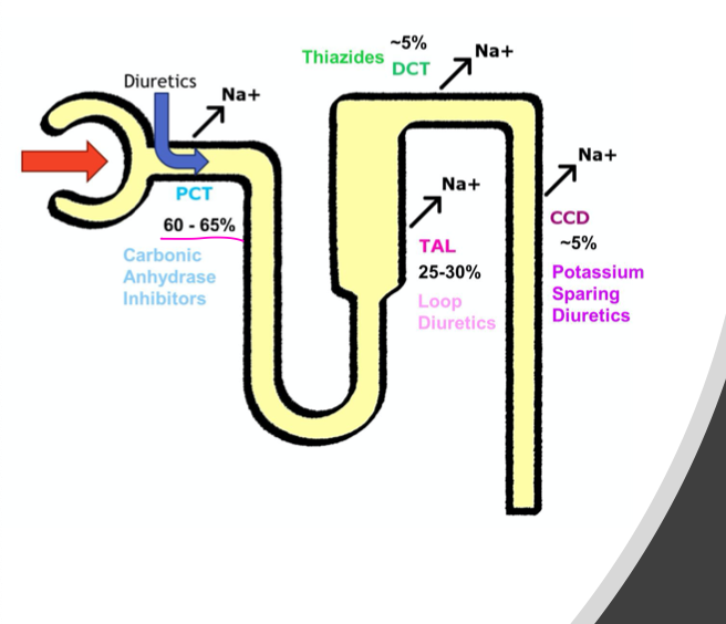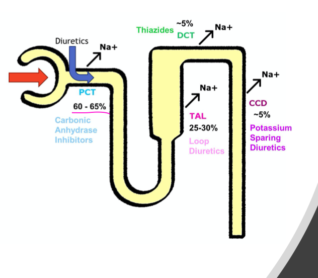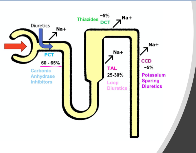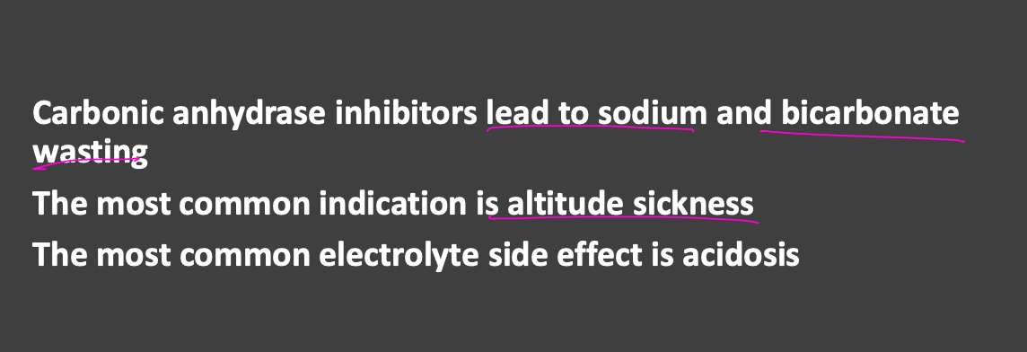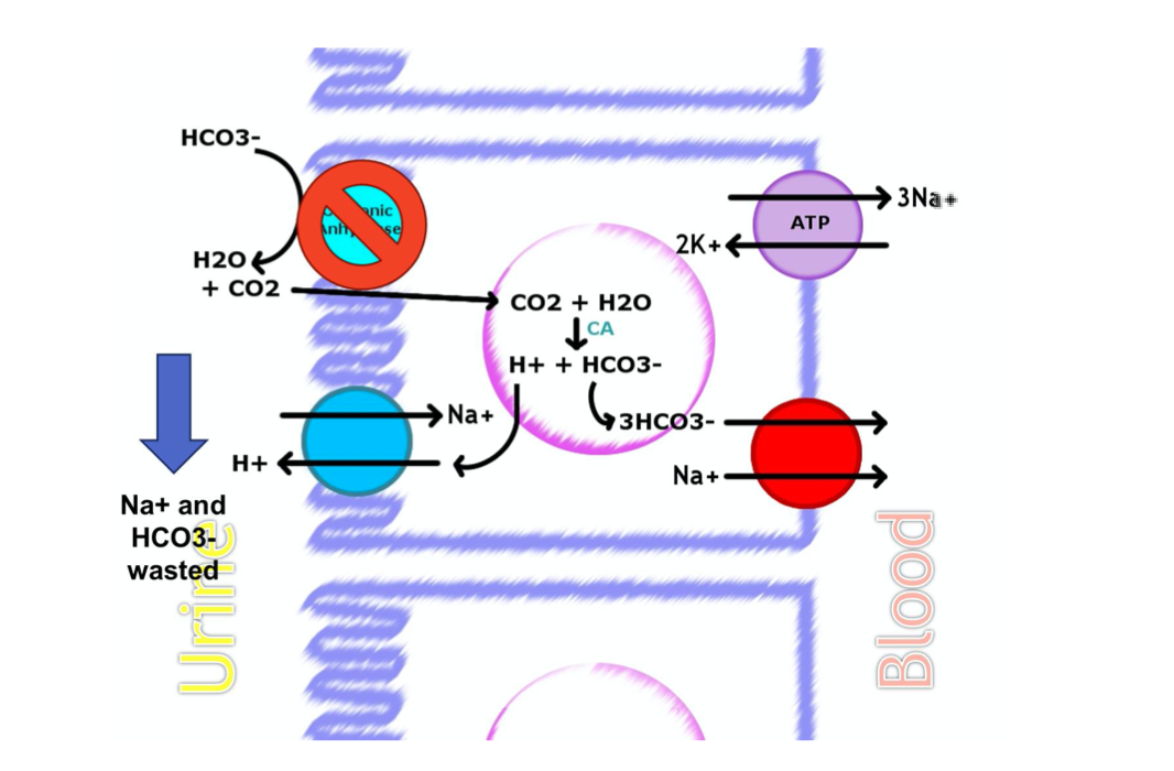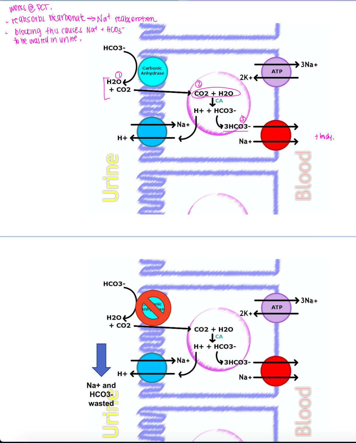MOA; NORMALLY, carbonic anhydrase on the lumen of the PCT cell converts bicarbonate to H2O and water. this H2O and water enters the cell, where it is buffered to H+ and HCO3-. the H+ gets transported back OUT of the cell into the urine, with Na+ being pumped into the cell through the Na/H+ transporter. Bicarb from the carbonic anhydrase buffering and Na+ get co transported back into blood, causing Na+ reabsorption and water follows. However, when CA is BLOCKED by acetazolamide, there is no bicarb to cotransport with Na+, leaving Na+ in the diltrate. there is sodium wasting and thus promotes diuresis