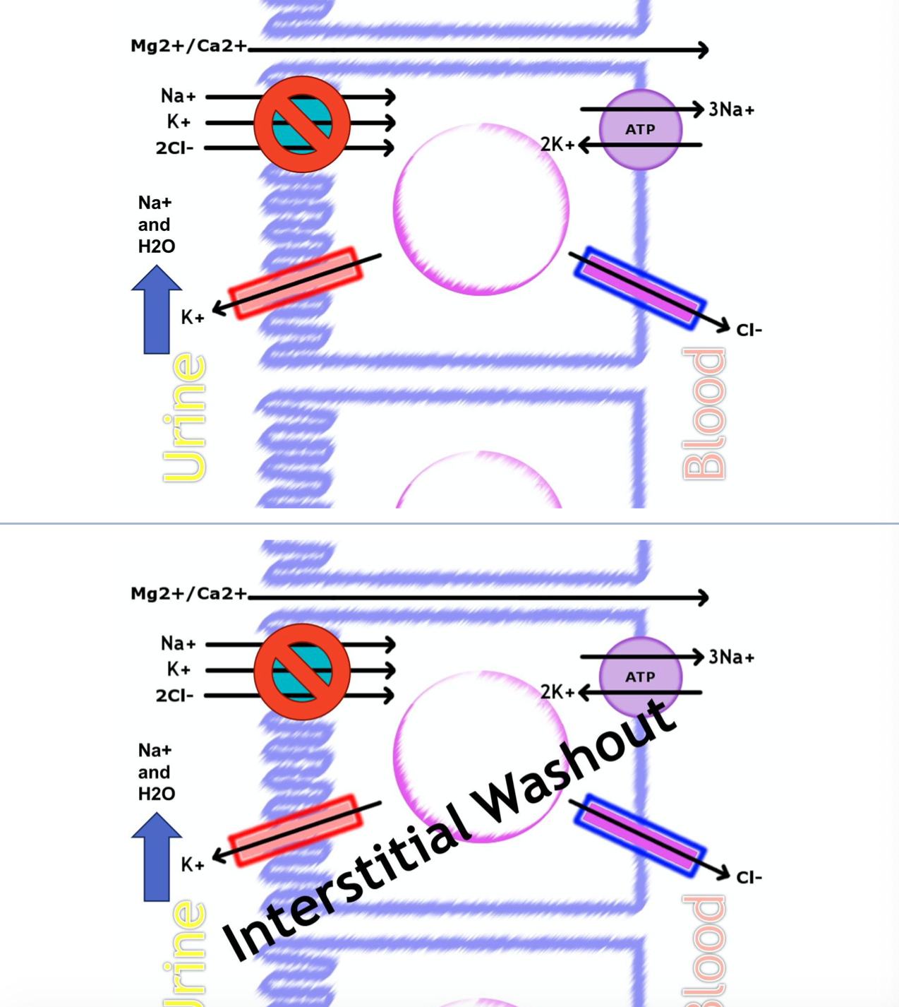 MOA; normally in the ascending loop, Na+ is reabsorbed but it is impermeable to water. the 2NKCC transporter transports Cl, K, and Na from the filtrate back to the cell/. K+ is pumped back out, but Cl- is shuttled into the blood. the Na+ is reabsorbed through the 3Na+in/2K+out exchanger. FUROSEMIDE INHIBITS the 2NKCC channel, preventing any reabsorption of K+, Cl or Na+. Thus, Na+ accumulates in the ascending loop, causing interstitial washout.