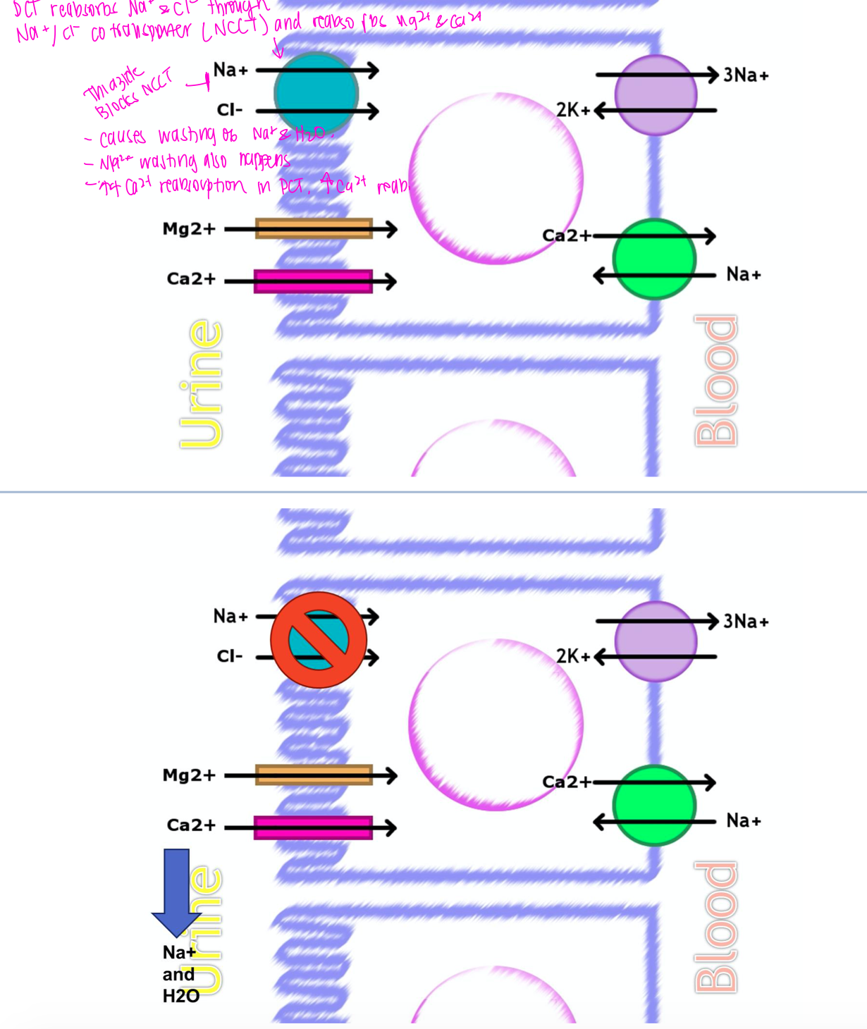 thiazide diuretics Block the NCCT (Na/Cl- co transport channel)