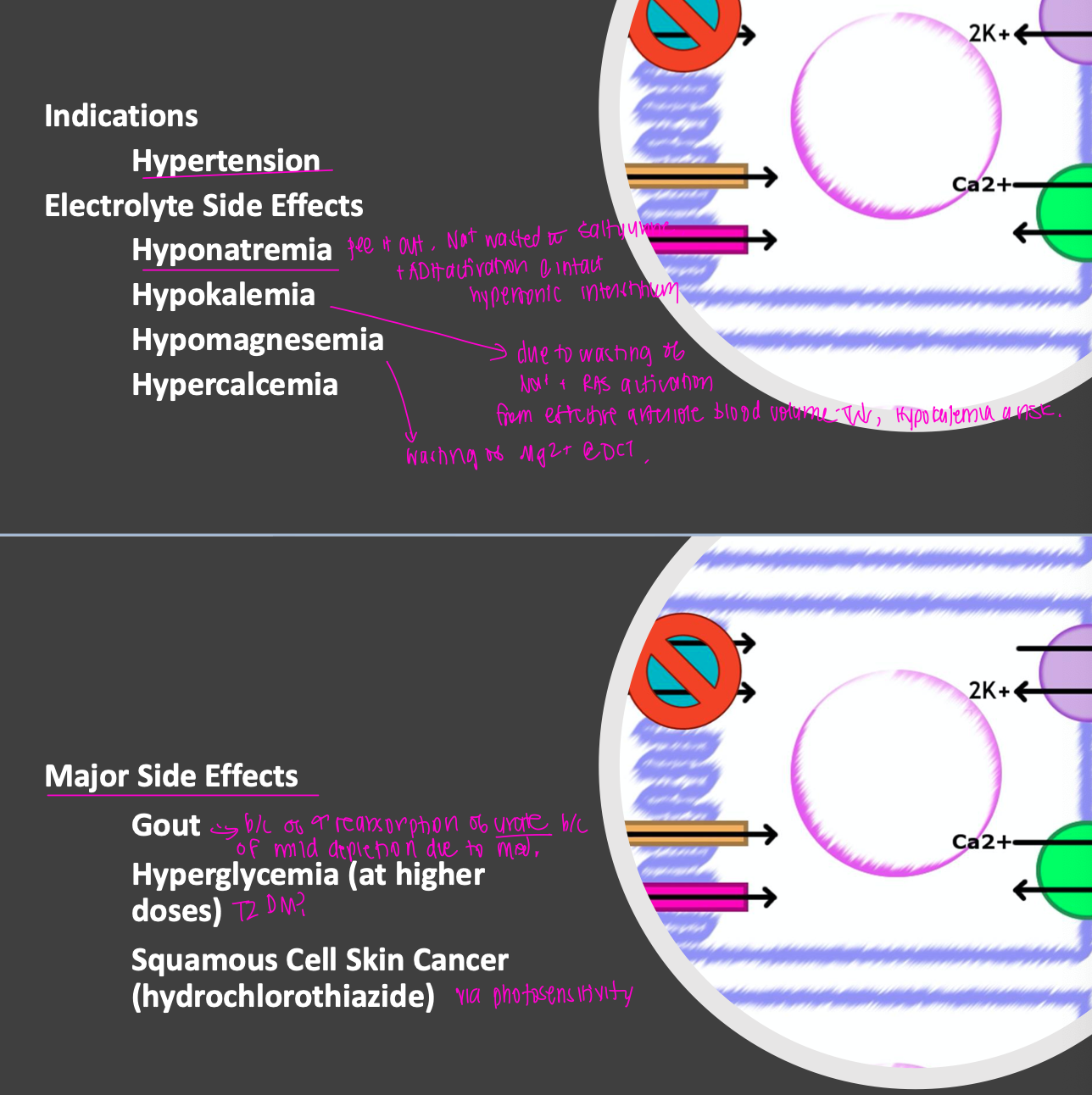 MOA: Normally, DCT reabsorbs Na+ and Cl- through Na+/Cl co transporter, and also reabsorbs Mg2+ and Ca2+ through channels. thiazide blocks the Na+/Cl- channel at the DCT, preventing Na+ reabsorption.