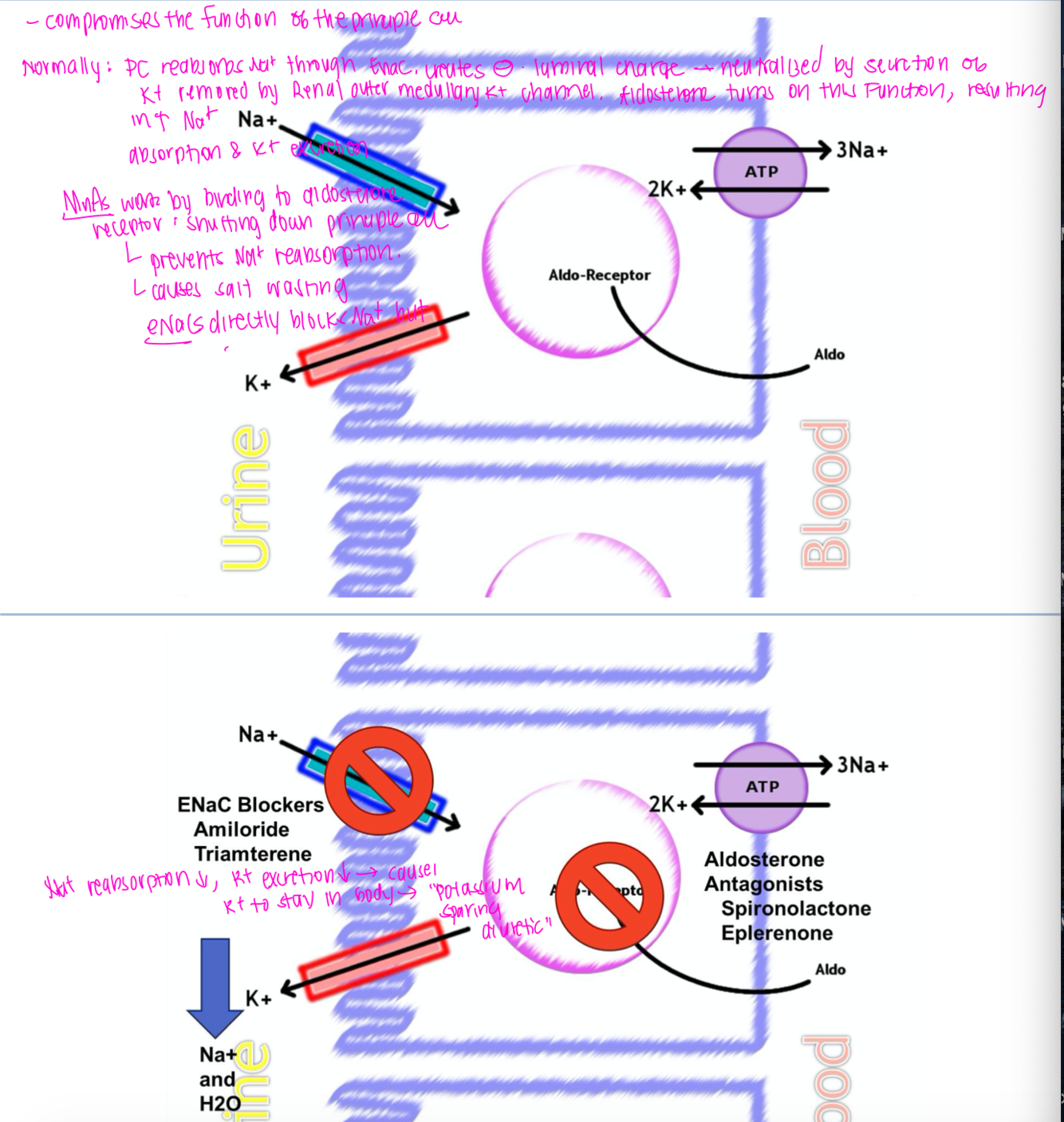When MNAs inhibit aldosterone/block its binding, it shuts down the principle cell and prevents na+ reabsorption, causing salt wasting.