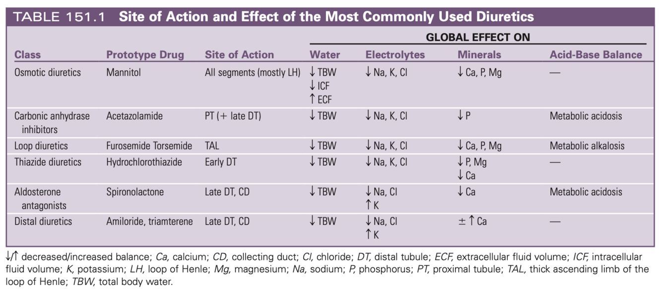 Name 6 classes of diuretics and where they exert their effect, and their global effect on: