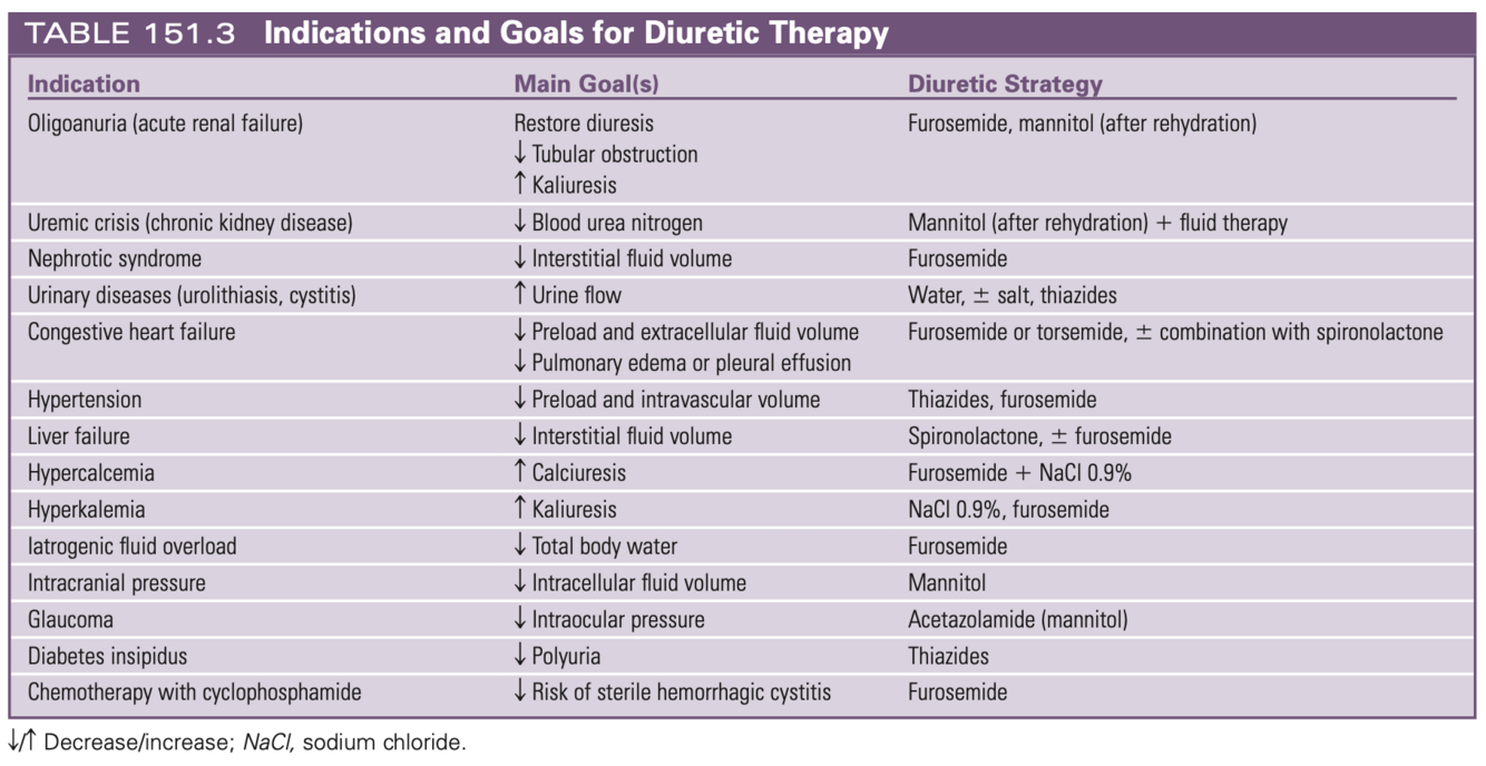 Name 14 indication for diuretic use and the goal of diuretic use.