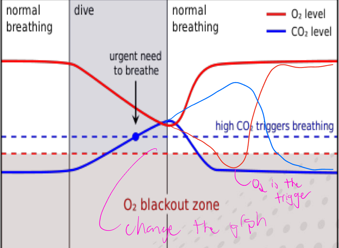 More O2 into blood without breathing. the increased pressure moves O2 into the blood. Tells the body we have enough O2
