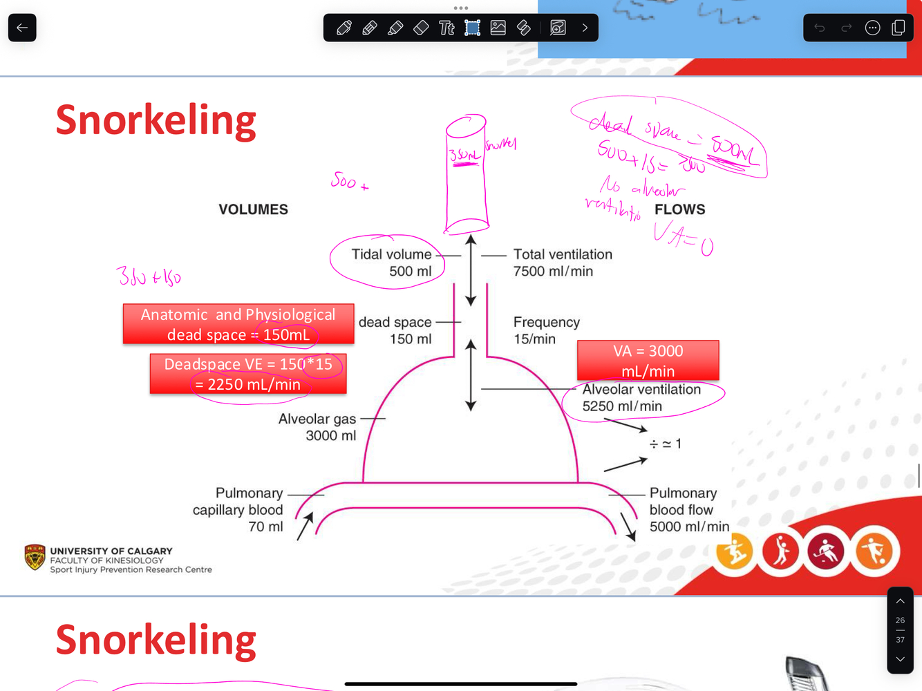 🫁 Snorkel adds dead space → more air volume that doesn’t reach the lungs.