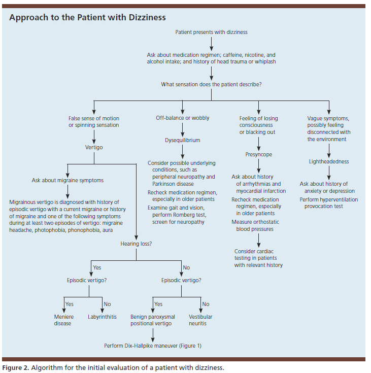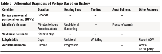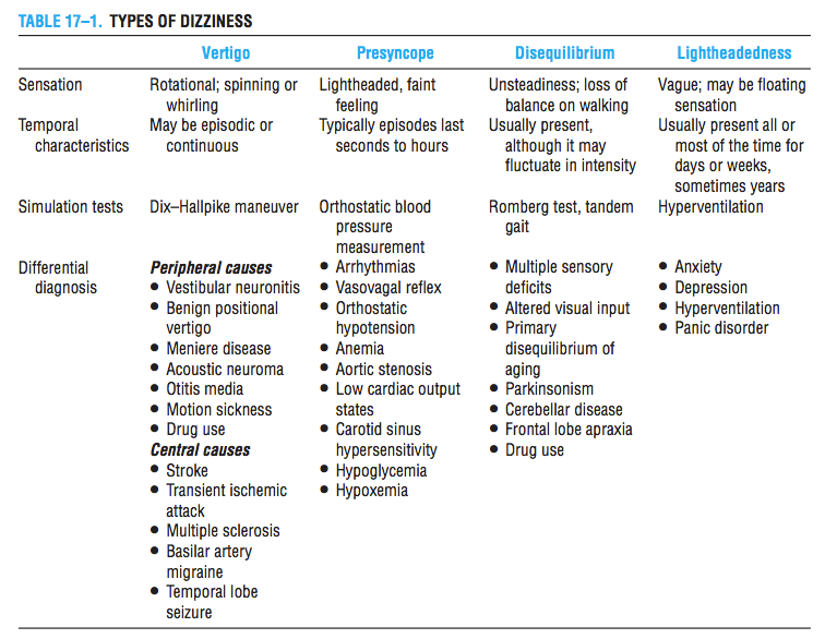 What are the 4 main types of dizziness (sensation, temporal characteristics, simulation tests, and differential diagnosis).