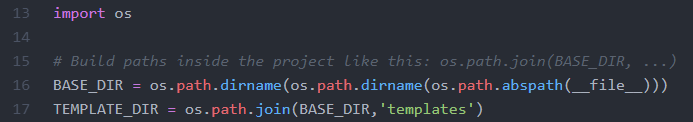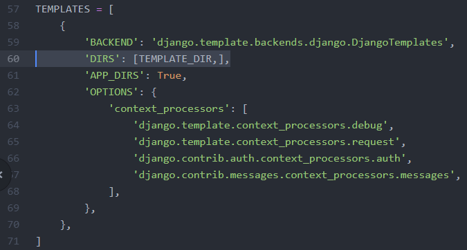 Pass it into the dictionary contained in the TEMPLATES object in settings.py. should be passed as the value to the ‘DIRS’ key in the form of a list with the first and only item being TEMPLATE_DIR.