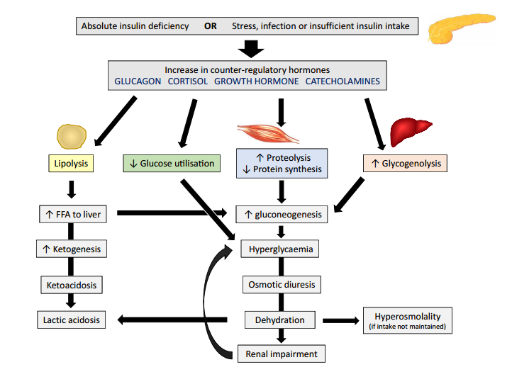 In the absence of insulin, hepatic glucose production accelerates, and peripheral uptake by tissues such as muscle is reduced. Rising glucose levels lead to an osmotic diuresis, loss of fluid and electrolytes, and dehydration. This results in plasma osmolality rising and renal perfusion falling. Vomiting leads to further loss of fluid and electrolytes.